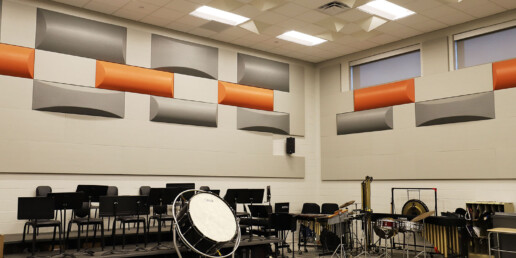 The walls of the Treehouse Story Room feature layered aCapella Scores-GamiLayers, including the whimsical “School Yard” pattern. These polyester panels absorb sound while adding texture and depth to the storytelling space, making it a warm and welcoming environment for young readers.