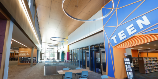 With clean lines, vibrant textures, and sound-absorbing materials, the newly designed library invites visitors to explore, learn, and connect in a refreshed, comfortable space.