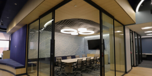 On the second floor, aCapella PartiTions encircle the atrium opening with a “Woodcut” pattern that echoes the library’s curated artwork. These PET panels offer sound absorption and subtle spatial separation, while maintaining visibility and connection across levels.